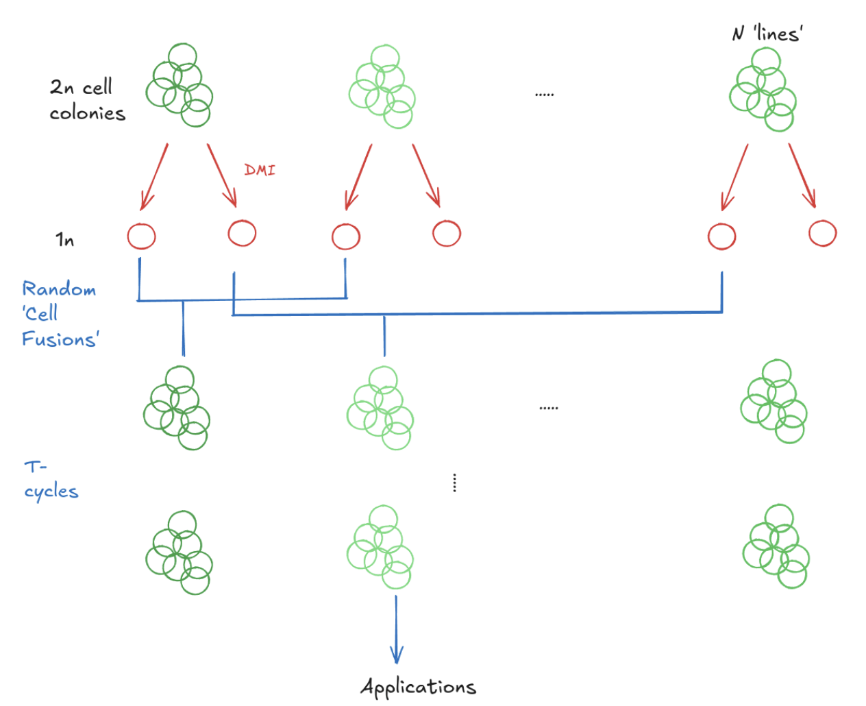 - 2. Second, that we can rely on cheap genotyping technology to choose which cell fusions to re-apply the process, rather than needing to actually observe their post-maturity phenotypes.