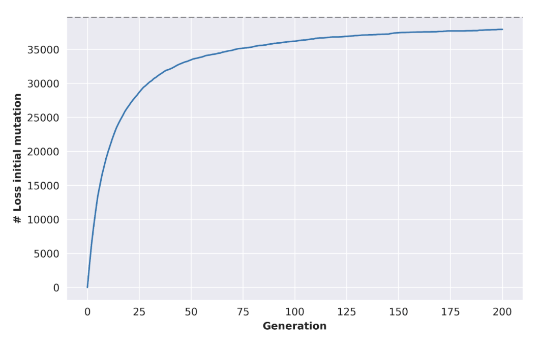The most simple way to select cell fusions at each generation is to calculate the number of somatic mutations for each cell fusion and only allow the top k to progress (expanding them out sufficiently to keep population size constant). In practice, this empirically results in a rate of decline for somatic mutations that resembles a power law curve: perhaps a familiar sight to evolutionary biologists as a common outcome whenever deterministic (selection) and stochastic (mutation) forces are commingled together: