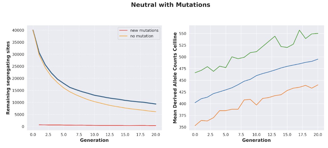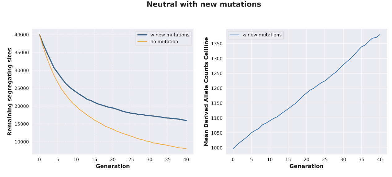 With certain simplifying assumptions, we can simulate the effectiveness of this process. Suppose, for example, that we begin with 100 initial cell “lines” (representing, e.g., 100 different biopsies taken from different sites. Under the Wright-Fisher model, where our population of cells is repeatedly re-expanded to a fixed size and randomly mating, we can see that the prevalence of somatic mutations progressively declines with the generation count: